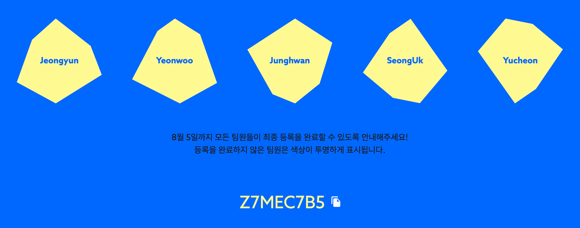 우리 팀은 4명으로 팀이 구성되어있었지만, 최대 5명까지 팀원을 구성할 수 있었기 때문에 추가로 한 명의 팀원과 함께할 수 있었다. 행사가 영어로 진행되기 때문에 발표도 영어로 했어야 했는데 우리 팀에 영어에 자신이 있는 팀원은 없는 것 같아 어느 정도 영어에 능숙한 팀원을 추가로 영입하기로 했다. 또한, 디자이너는 충분한 것 같아 배제하고 개발에 대해 어느 정도 이해가 있는 팀원을 찾아봤다. 팀원으로 적합한 분이 있어 DM으로 현재 팀원들 소개와 함께 같이 하자고 제안드렸는데 좋다는 의사를 밝혀주셔서 바로 팀원으로 함께하게 되었다! 미리 팀 디스코드 채널을 만들어서 어떤 식으로 개발을 진행할지 얘기하면서 간단히 계획을 세웠다.