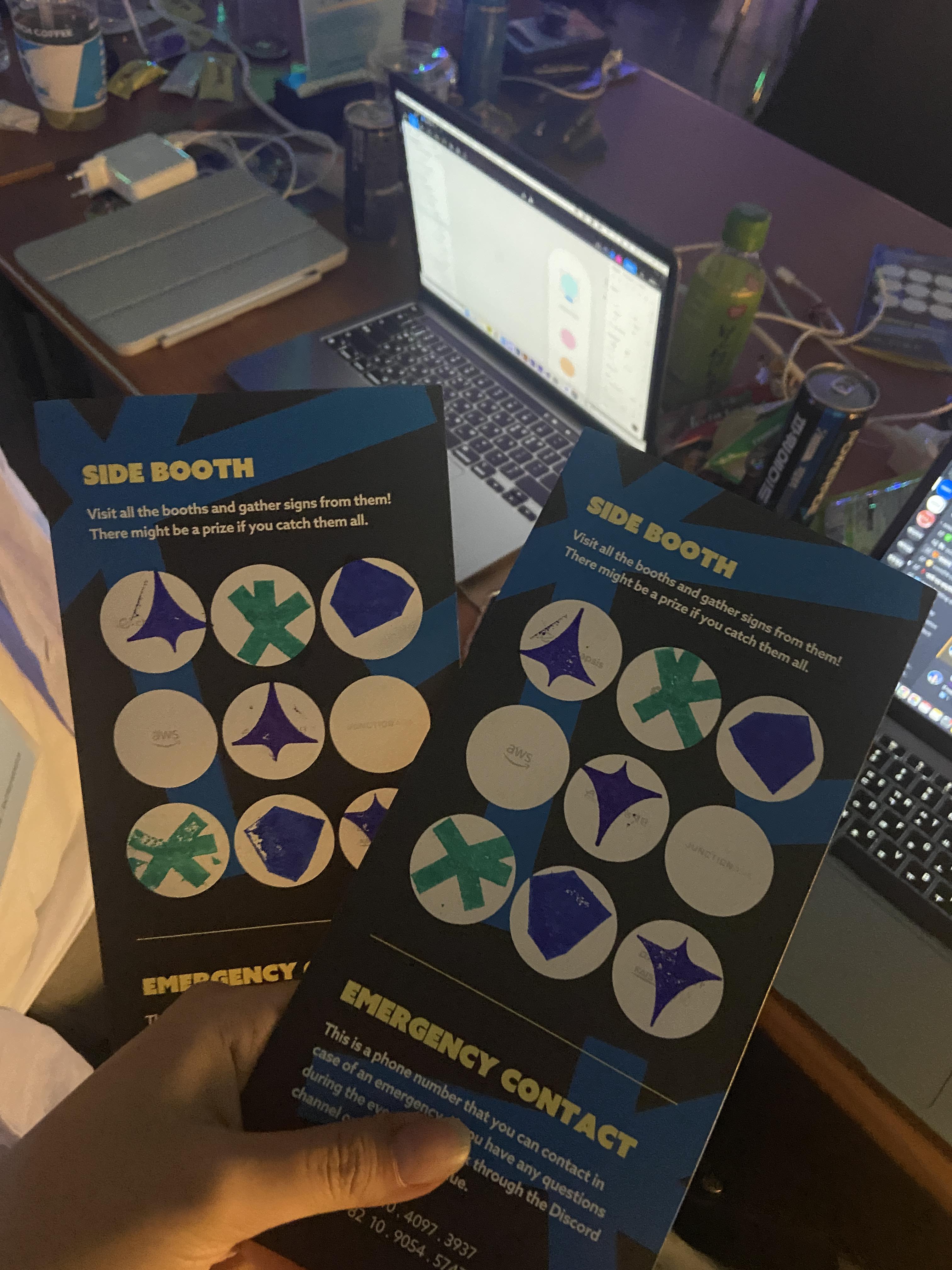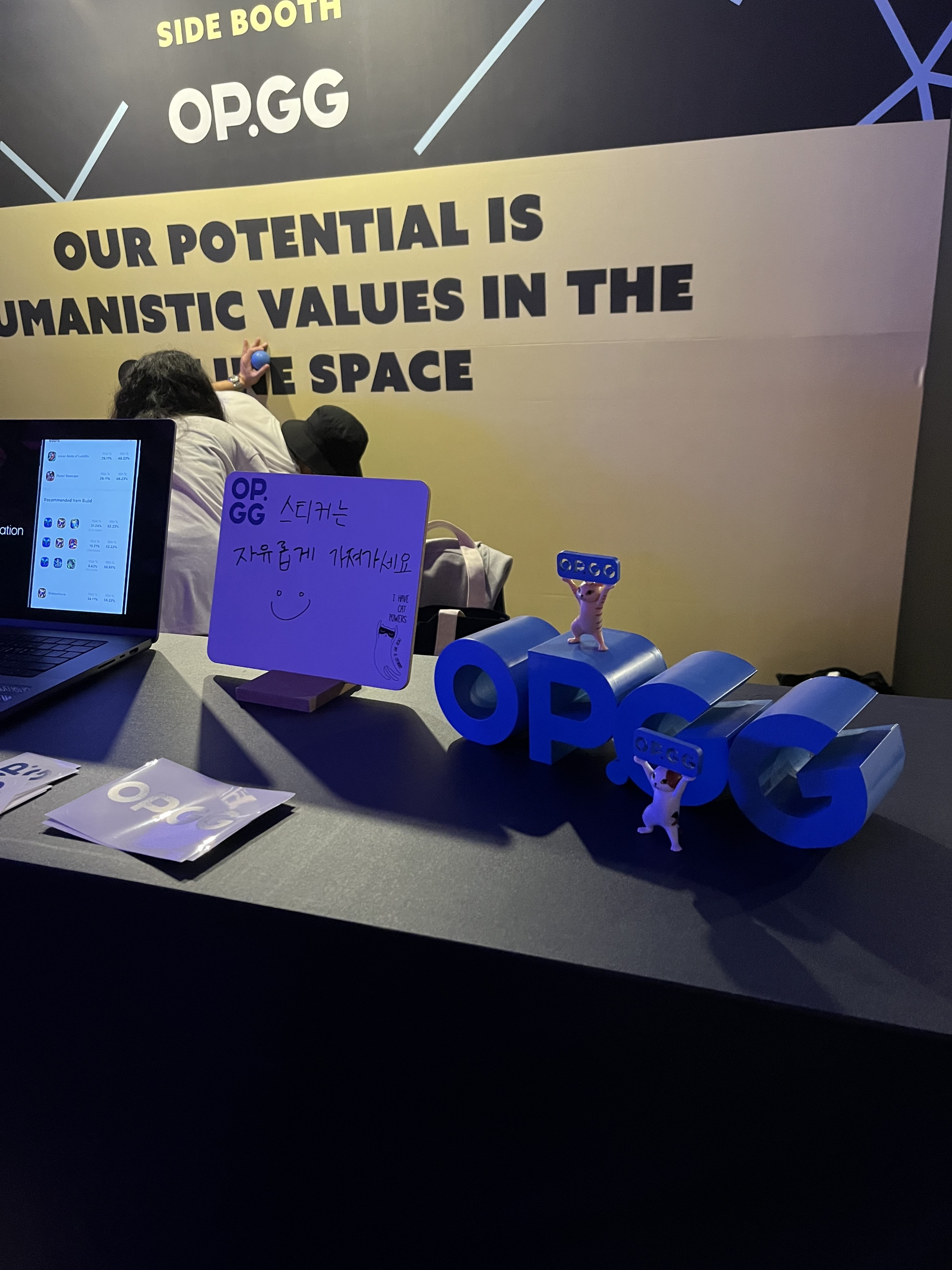 디자인할 요소가 많지 않아 생각보다 디자인 작업이 대부분 빨리 마무리되어 행사장 내의 부스들을 둘러봤다. 4개의 트랙 주제를 제시한 회사들의 부스도 있었고, OP.GG, Cloudtype 등 사이드 부스에서도 다양한 이벤트와 행사를 진행하고 있었다. 부스를 돌면서 스탬프도 받고, 회사들의 소개와 함께 스티커나 티셔츠 같은 굿즈들도 받을 수 있었다.