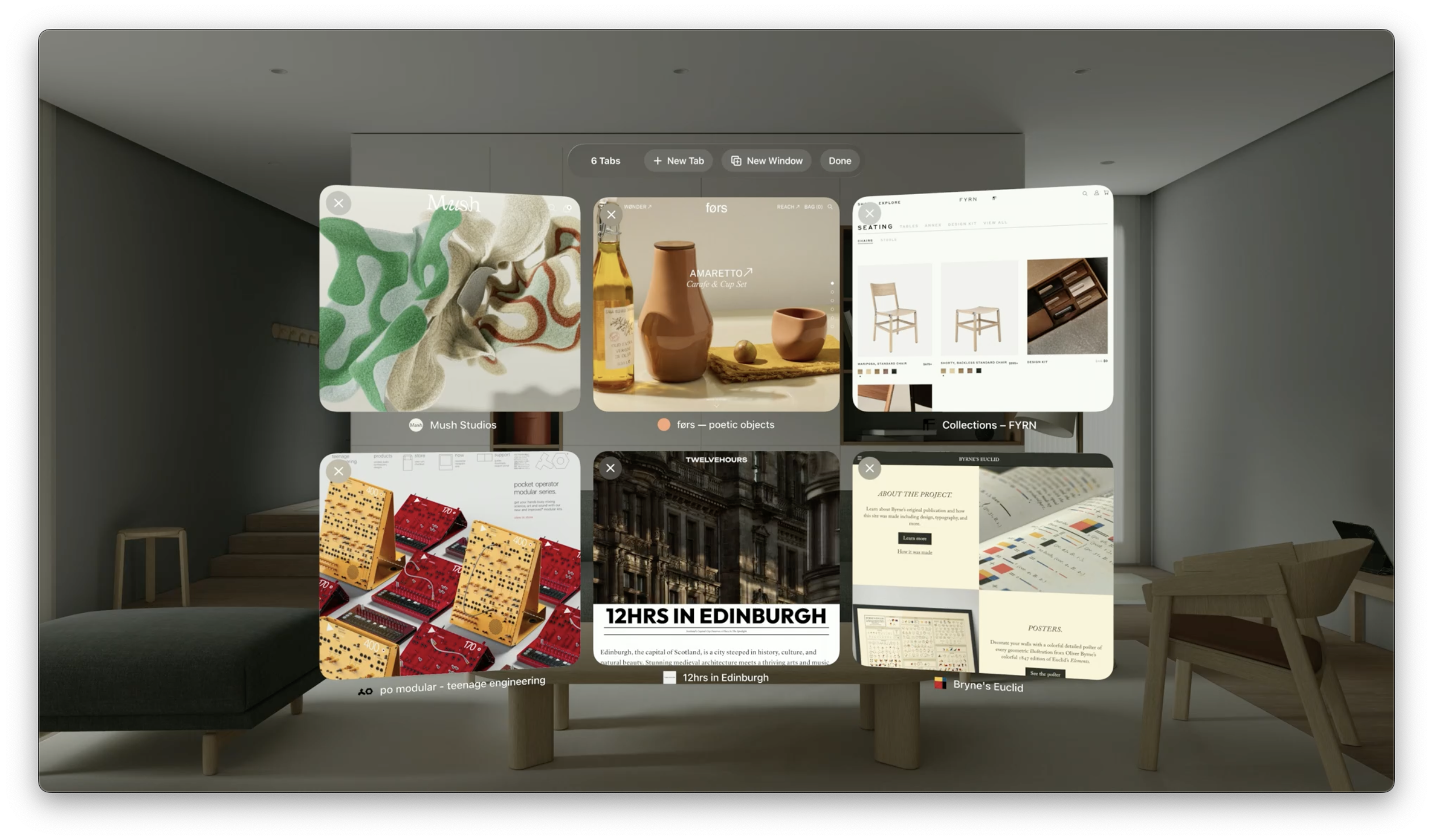 예를 들어, Safari에서 모든 탭을 한 번에 볼 때, 격자 형태로 탭들을 보여주는데, 이 레이아웃은 사람들의 시야 범위에 맞추기 위해 넓게 설계되었다. 탭은 중심에서 너무 멀리 떨어지지 않도록 너무 크지 않게 보여주고, 양쪽의 탭은 안으로 향하도록 되어 있어서 읽기가 쉽다. 그러나 사람들은 늘 머리를 완전히 고정하지 않고 주변을 둘러본다. 이는 몰입형 경험을 위해 콘텐츠를 추가로 확장할 수 있다는 의미이다. 그러나 일반적으로 주요 콘텐츠를 시야 범위 내에 유지하지 않으면 한 번에 모두 읽거나 이해하기 어렵다.
