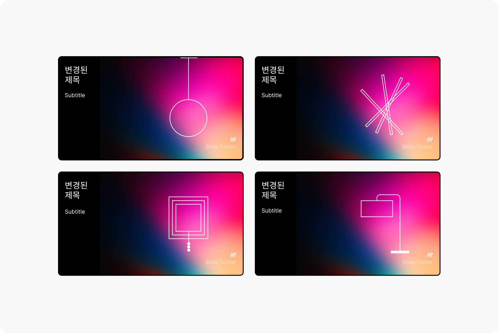 기존에는 아래와 같은 슬라이드 페이지를 동일하게 수정하기 위해서는 각각의 오브젝트를 선택해서 변경해야 했다. 텍스트를 동일하게 바꿔야 할 경우 텍스트를 하나씩 선택해 수정하기도 했다.