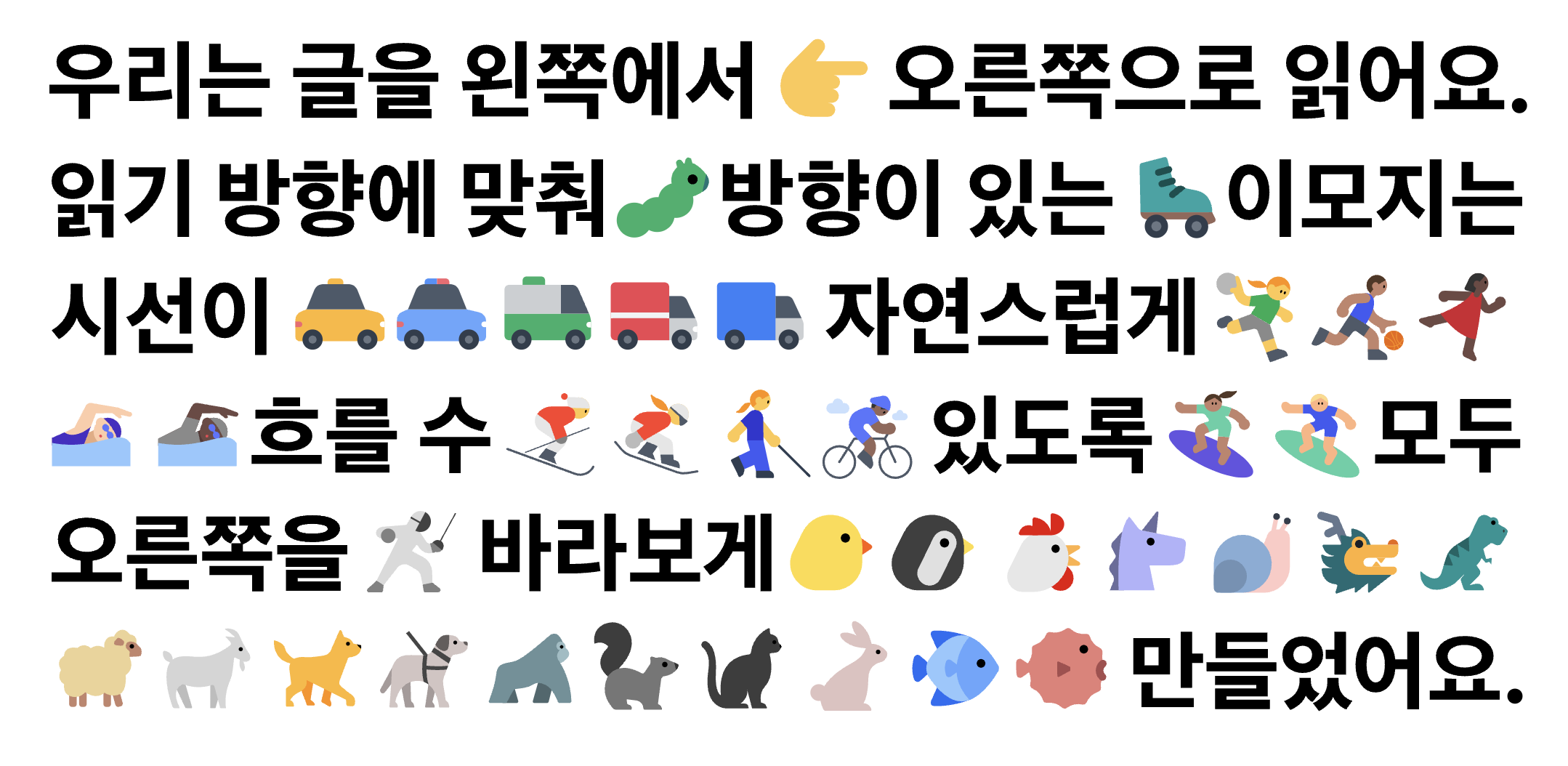 왼쪽에서 오른쪽으로 글을 읽는 방향에 맞추어 방향이 있는 모든 이모지는 오른쪽을 바라보고 있다.