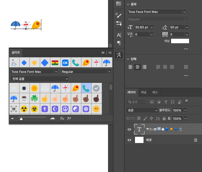 Keynote나 MS Office에서는 기존에 이모티콘 사용하던 방식처럼 [Control(⌃)+Command(⌘)+Space bar]로 사용할 수 있고, Adobe에서는 Tossface Font Mac을 선택한 후 Type - Glyps(글리프)에서 선택해서 사용할 수 있다.